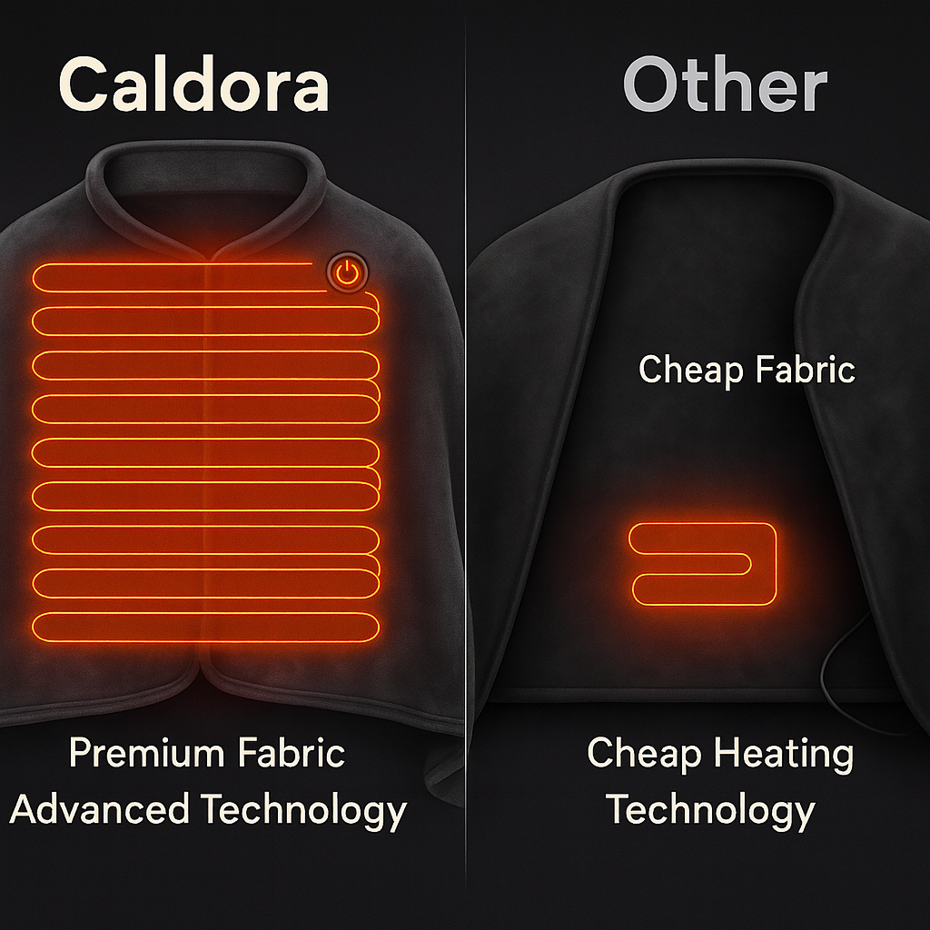 The Caldora Heated Zip-Up Blanket delivers reliable warmth without worry. Unlike cheap imitations that can overheat or cause burns, ours is built with premium materials and advanced heat control for safe, soothing comfort — indoors or outdoors.